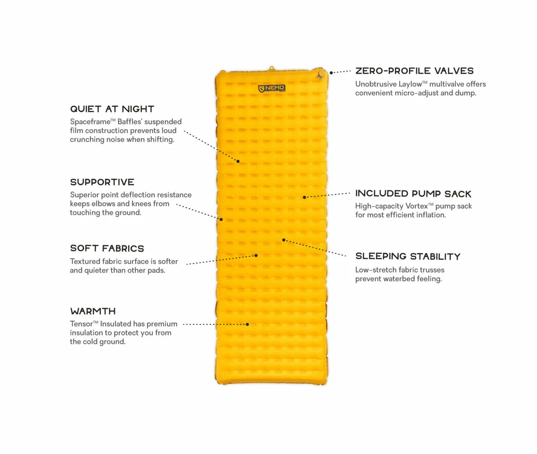 Offering quieter, more supportive sleep at a tiny packed size, Tensor™ ultralight sleeping pad stands apart as the ultimate backcountry adventurer’s best friend. Updated with a zero-profile, micro-adjustable valve and included Vortex™ pump sack, NEMO’s lightest sleeping pad uses premium 20D fabrics to shave grams without sacrificing plush comfort.